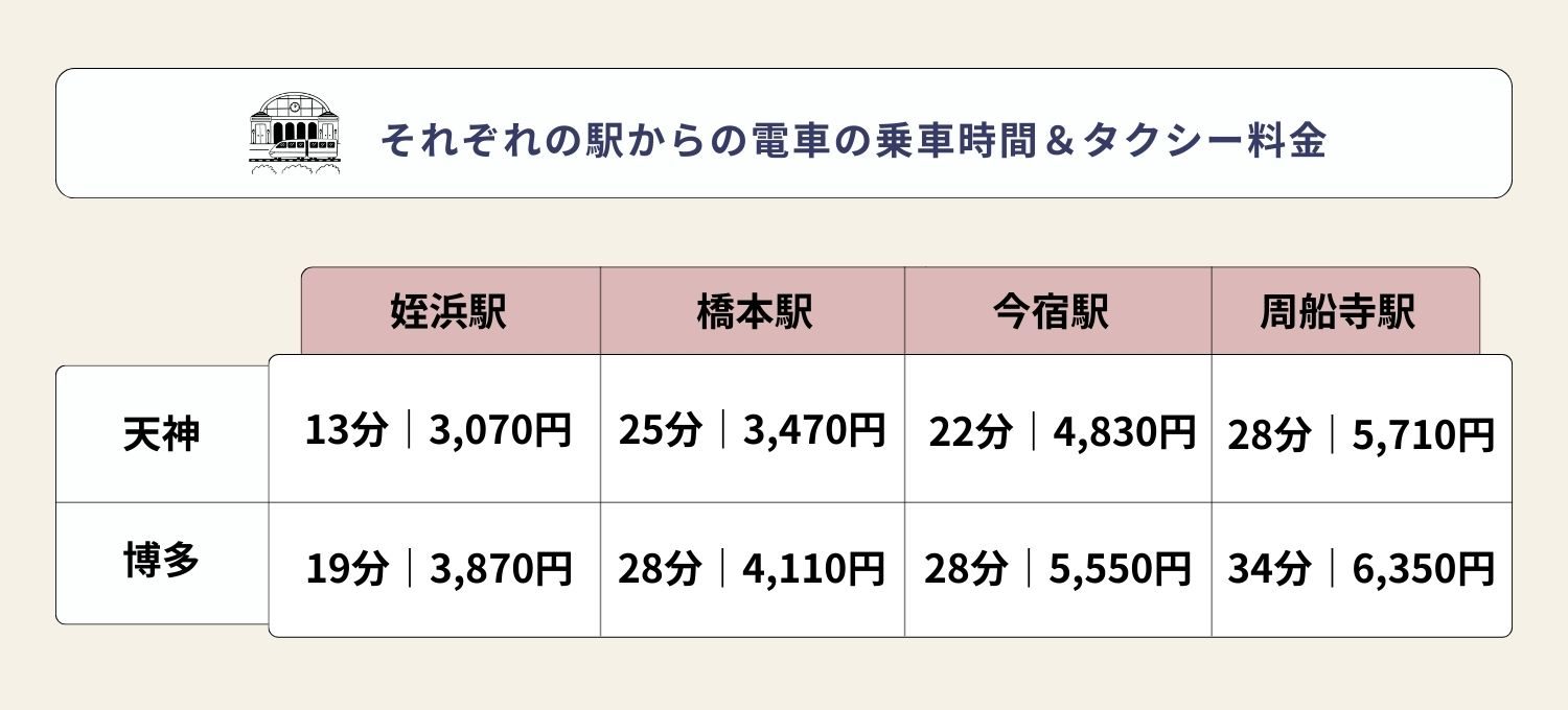 西区エリアの各駅から天神・博多までの「電車の乗車時間」と「タクシーの料金」を一覧にしてみました。