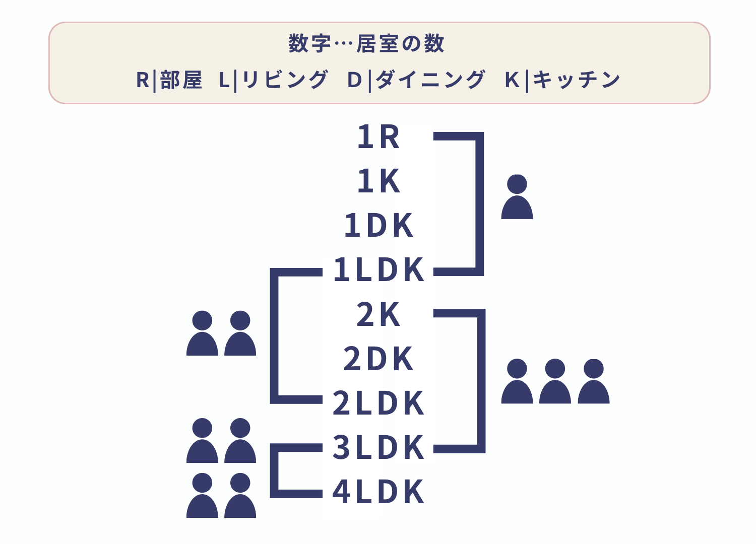 たとえば「1LDK」は「1つの居室+リビング+ダイニング+キッチン」という意味です。
