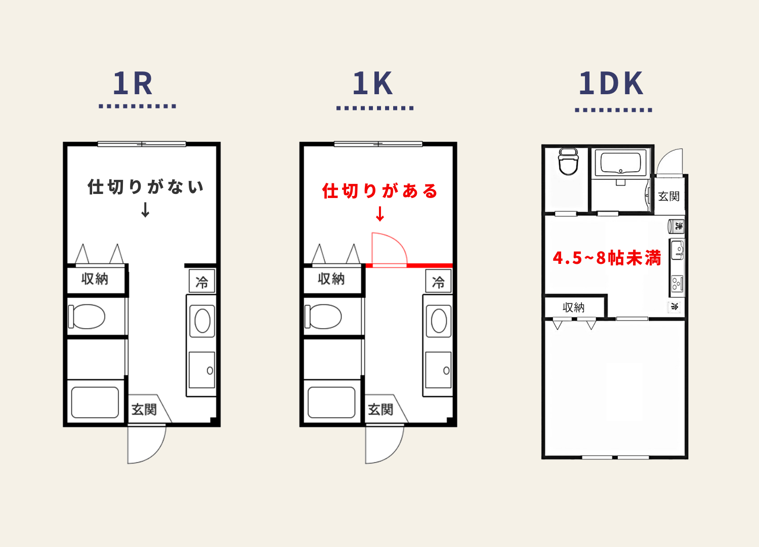 1R(ワンルーム)は仕切りがなく、シンプルで家賃を抑えたい方に最適。