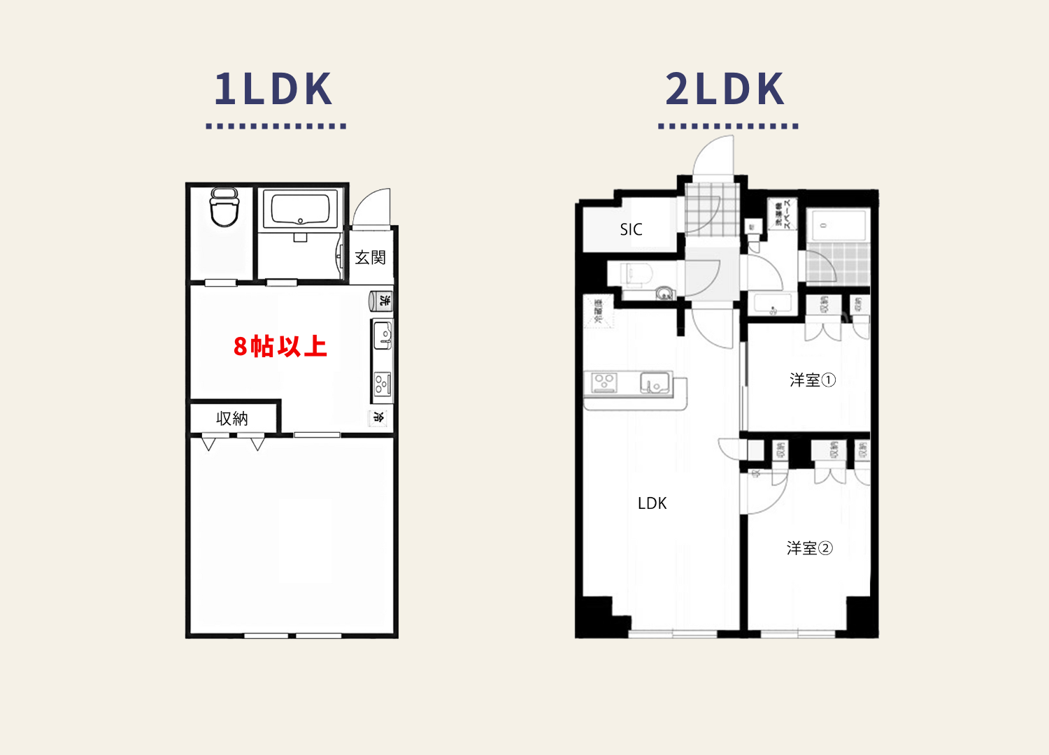 2LDKになるとそれぞれのプライベート空間を持てるため、在宅ワークや趣味部屋が欲しい方にも対応可能です。