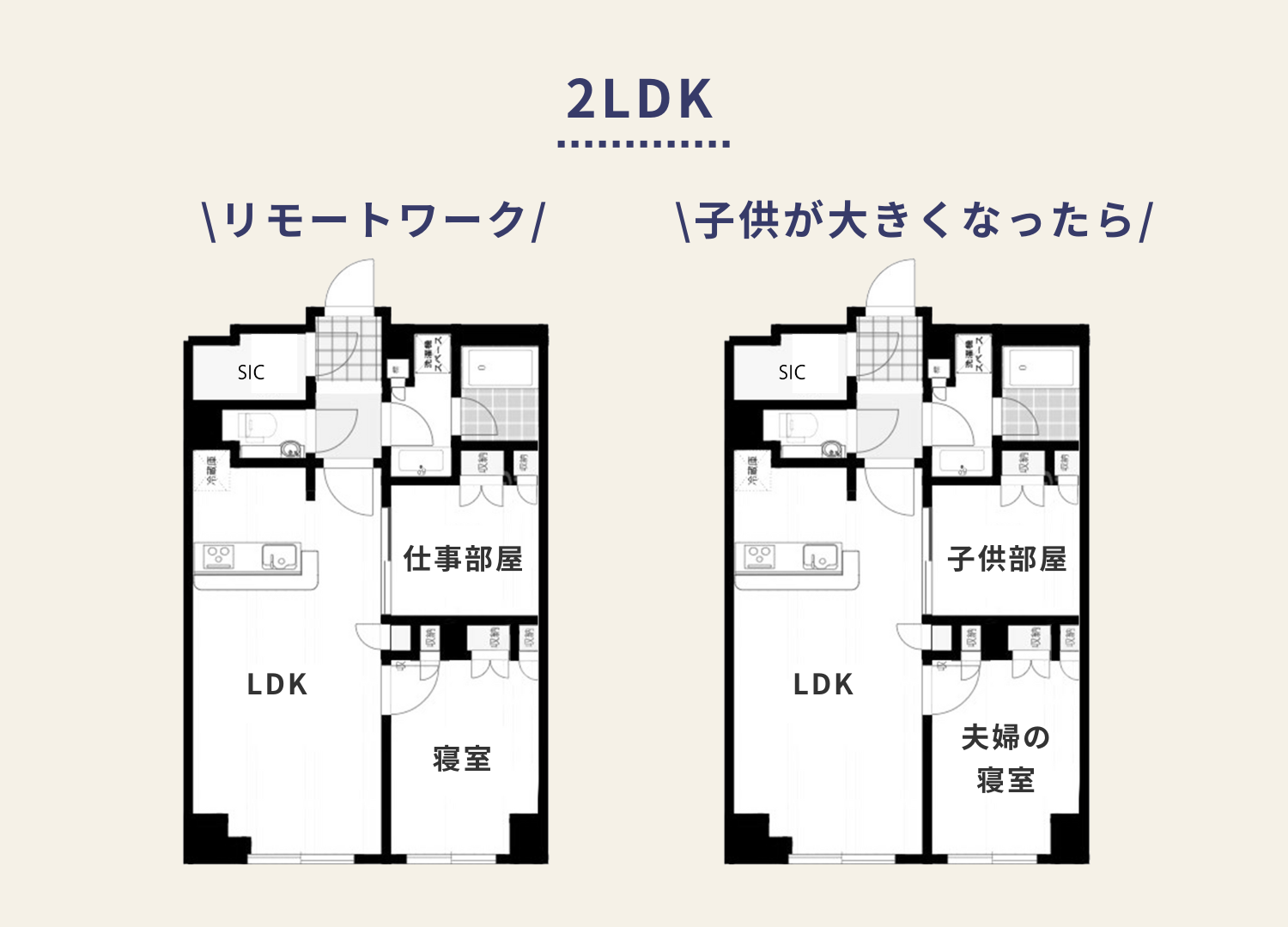 2LDKは、寝室+子ども部屋や仕事部屋などに使い分けができるため、家族の成長や働き方の変化にも対応しやすいです。