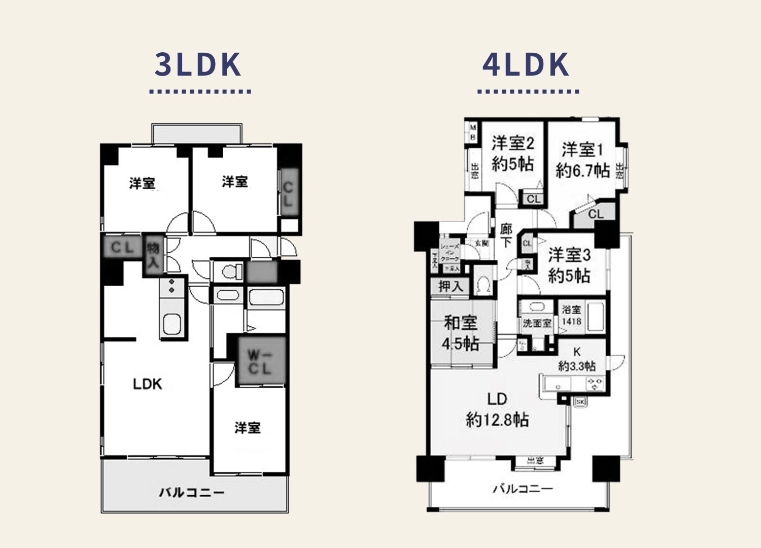 3LDK・4LDKは子ども部屋や仕事部屋、来客用の部屋などをしっかり確保でき、将来を見据えた住まいに適しています。